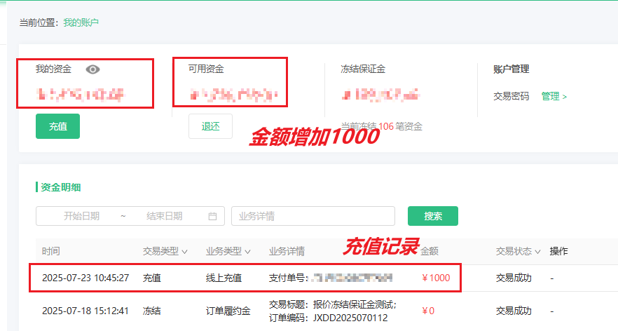 1.2.4在用户我的账户列表可以看到资金增加,以及对应的交易记录。