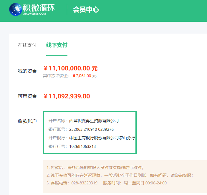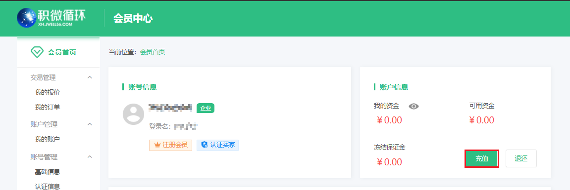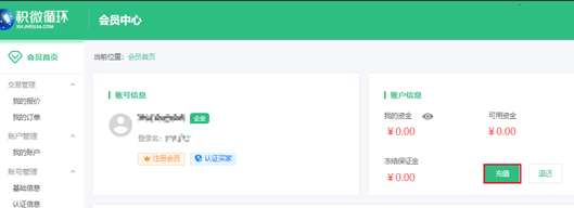 进入会员中心-充值,跳转到充值页面,线下公对公转到收款账户,平台收到款后充值到商户账户。