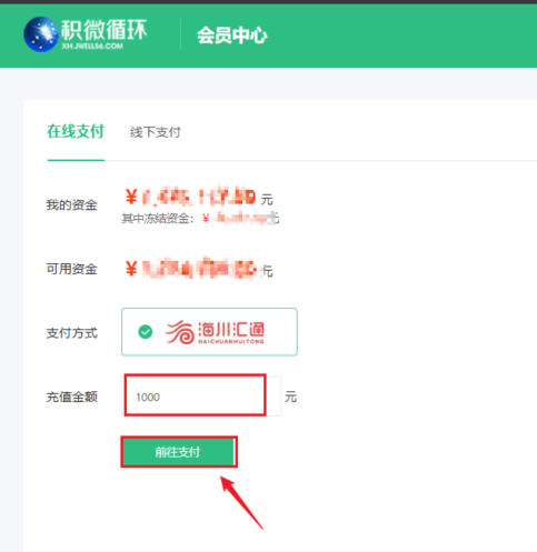 1.2.1若用户已开通海川汇通,点击【充值】后,进入在线支付页面,在充值金额输入框,输入要充值的金额,点击【前往支付】按钮。