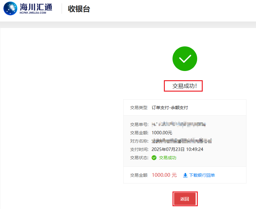 1.2.3支付成功后,系统提示交易成功,到这里就完成了在线支付,平台保证金会充值到用户账户中。