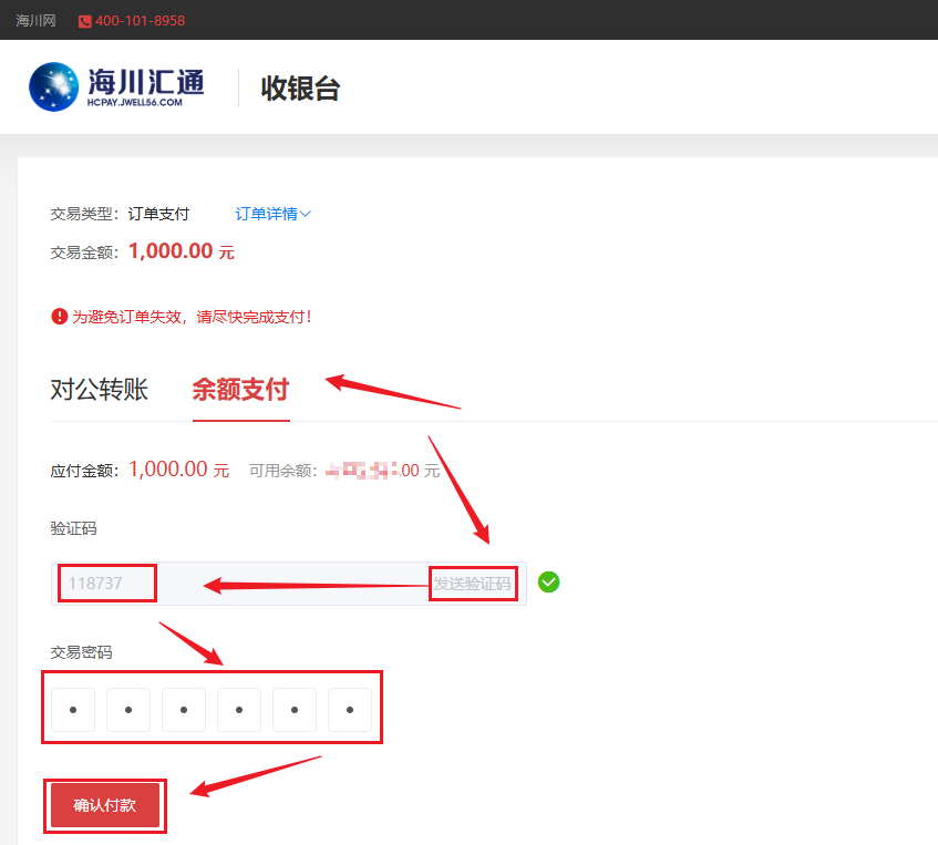 1.2.2在海川汇通收银台选择支付方式,点击【发送验证码】获取手机验证码,输入验证码输入框,输入交易密码,然后点击【确认付款】: