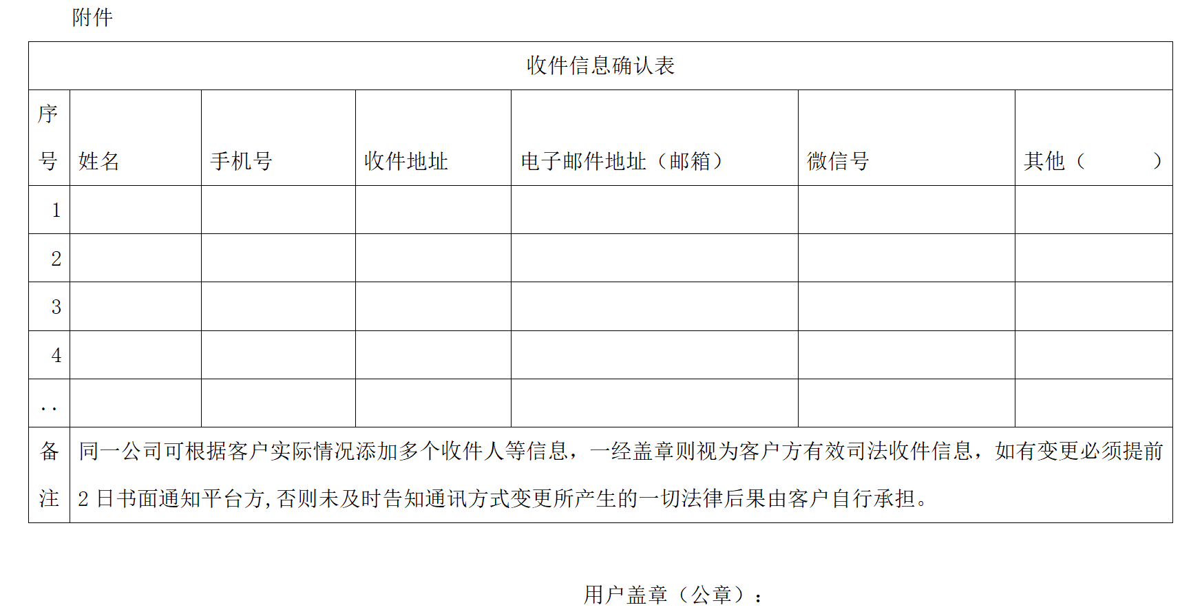 4.3认证用户按平台要求预留联系方式,包括但不限于公司地址、收件地址、联系电话、管理员等信息,当客户信息发生变动时,变更必须提前2日书面通知平台,否则未及时告知通讯方式变更所产生的一切法律后果由用户自行承担。