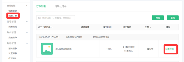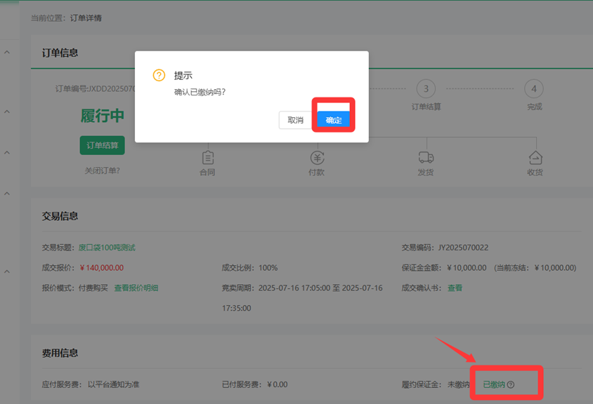 用户完成履约保证金缴纳后,可在交易管理-我的订单-订单详情页面,点击履约保证金后【已缴纳】按钮,并确认。待卖家操作确认后释放保证金