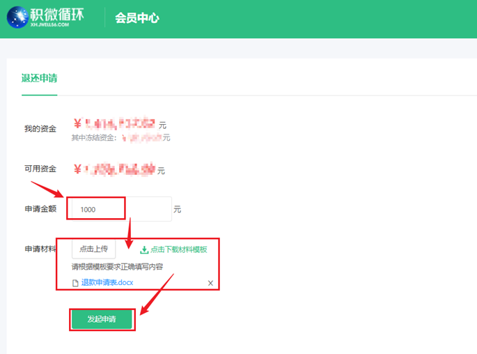 2.在退还申请页面,输入申请退还的金额,上传申请附件材料,点击【发起申请】,如所退保证金成交过订单还需将附件原件邮寄给循环平台,邮寄地址详见模版。