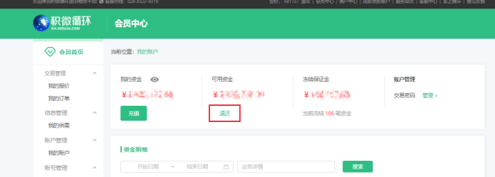 1.在会员首页/我的账户页面,点击【退还】按钮。