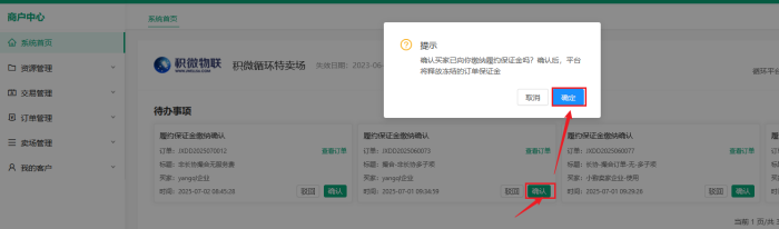 在商户中心首页,待办事项中,找到买家申请释放保证金的订单,已收到履约保证金点击【确认】按钮,并确定后,买家的平台保证金即可释放。未收到履约保证金则点击【驳回】,买家的平台保证金则继续冻结。